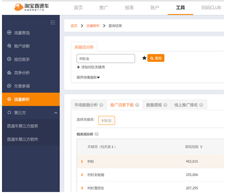 直通车键入目标关键词同样会给出很多相关拓展词,此处也是我们备选关键词词库的源泉。3、生意参谋—市场—搜索分析