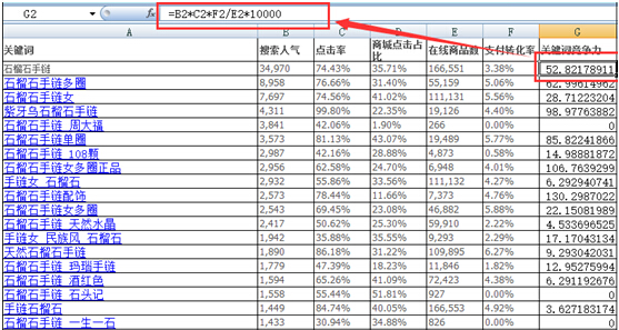 2、借助生意参谋-市场-搜索分析,计算关键词的竞争力。如果我们店铺是集市店,那么可以简单的将数据的不同维度定义为正向指标和负向指标,正向指标相乘作为分子,负向指标相乘作为分母,最终得 到每个关键词的竞争力;